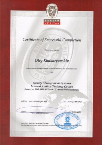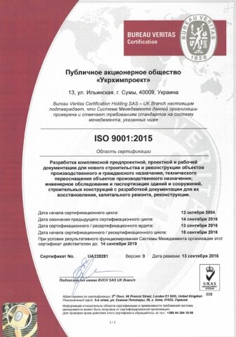 На сегодняшний день в ЧАО "УКРХИМПРОЕКТ" разработана, сертифицирована и функционирует Система менеджмента качества (СМК), соответствующая требованиям международного стандарта ISO 9001:2015 (сертификат BUREAU VERITAS Certification от 15 сентября 2016 г. № UA228281. Ресертификация от 13.09.2016). ЧАО "Укрхимпроект" является членом саморегулируемой организации некомерческого партнерства, специализированных предприятий нефтехимической и нефтегазовой промышленности "НЕФТЕГАЗСЕРВИС" (рег. номер СРО-П-006-30.11.2009) и имет свидетельство №006-15.11.2009г. на право осуществления деятельности на територии Российской Федерации по архитектурно-строительному проектированию, техническому обслуживанию зданий и сооружений 1 и 2 уровней ответственности и деятельности по контролю качества в соответствии с государственными стандартами. Права Института на выполнение проектных работ на територии Украины подтверждены Гсударственной лицензией министерства регионального развития и строительства Украины (АВ №489624 от 19.10.2009г.).